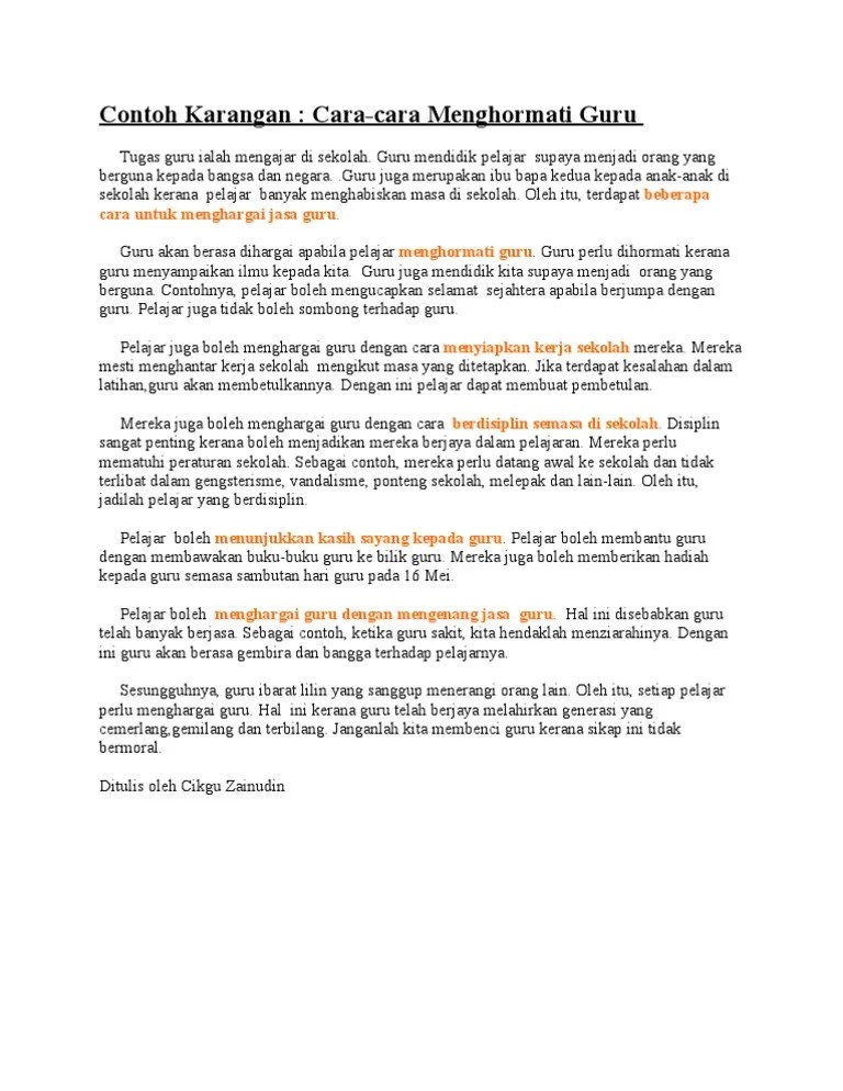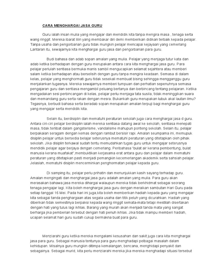 View CARA MENGHARGAI JASA GURUdocx from MALAYSIAN 123 at Sunway University College. KARANGAN PT3 - CARA MENGHARGAI JASA GURU - KARANGAN TEMA HARI GURU Hari Guru disambut pada 16 Mei setiap tahun sebagai tanda memperingati dan. Cara Menghargai Jasa Guru.